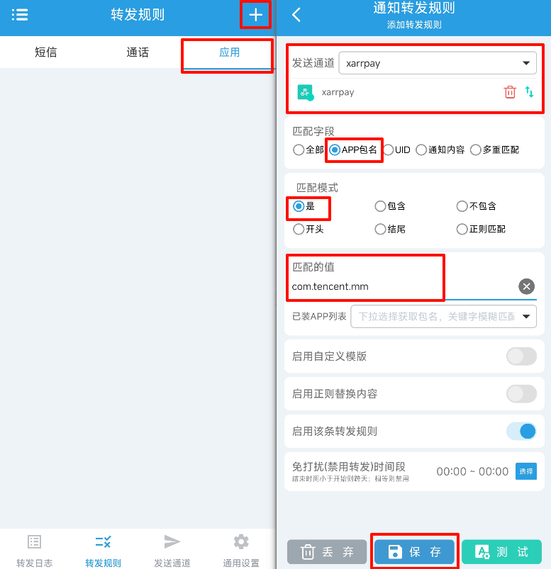 在的应用页中新增转发规则,选择上一步新增的发送通道,匹配字段选择APP包名,匹配模式选择是,匹配的值可以下拉选择APP,点击保存