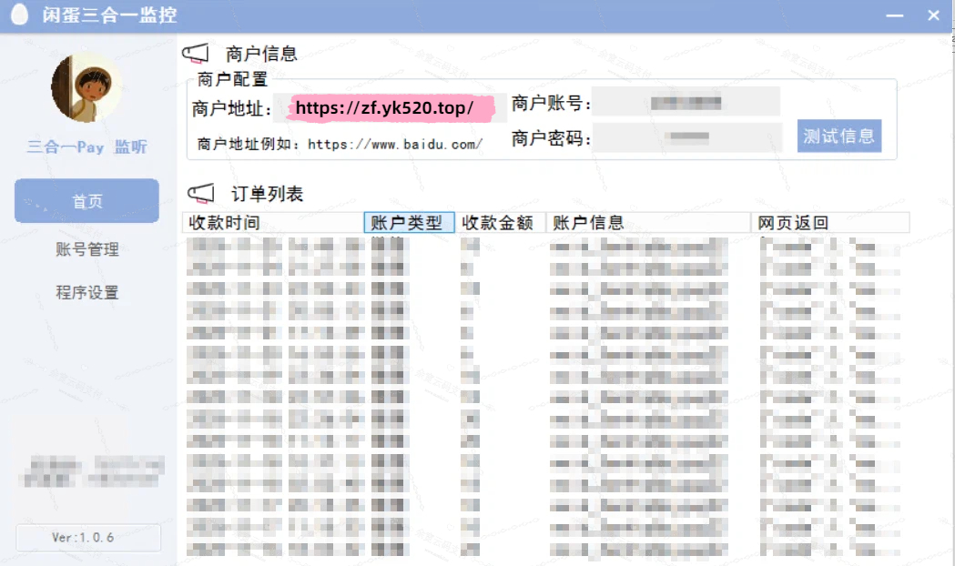 3、解压后复制到服务器,打开三合一监控V106监控程序(bug:提示有新版本),点确定,然后叉掉浏览器就行。输入商户地址,商户账号,商户密码,点测试信息(提示身份验证成功就可以了)