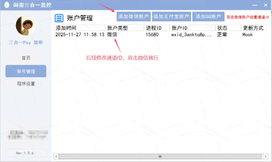 4、点账号管理,点添加微信账户,输入你码支付后台显示的通道ID,输入好以后确认输入就行,然后回到码支付后台,刷新一下看看通道是否显示为状态正常了,是就可以去测试支付能否跳转了。